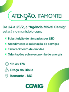 A cidade de Itamonte receberá nesta semana a Agência Móvel de Atendimento da Cemig, proporcionando mais facilidade aos clientes e incentivando o uso consciente de energia elétrica. Técnicos da companhia estarão à disposição para esclarecer dúvidas, realizar serviços e orientar sobre segurança e economia de energia.